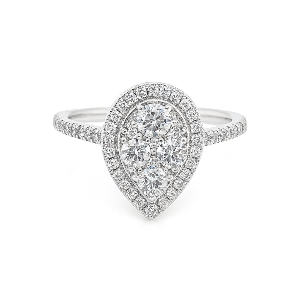 This stunning Pear-shaped cluster ring showcases a total of 1.04 carats of lab-grown diamonds, exquisitely set in polished white gold. A brilliant cluster of round diamonds forms the centrepiece, surrounded by a sparkling diamond halo and finished with a diamond-set shoulder for maximum sparkle from every angle.