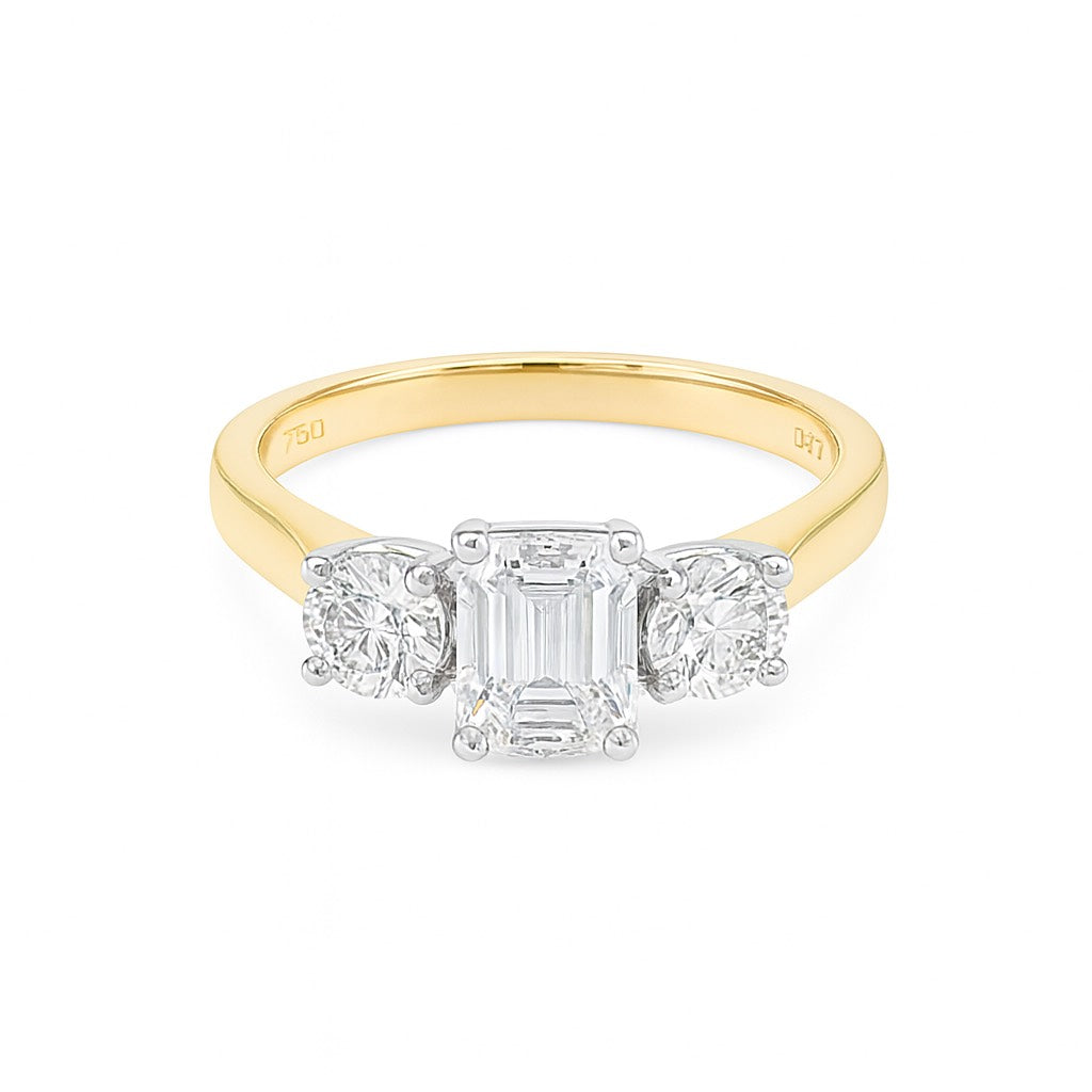 This elegant three-stone ring features a stunning 2.00ct total of lab-grown diamonds, beautifully set in warm 9ct yellow gold. At the center sits a sophisticated emerald-cut diamond, celebrated for its clean lines and mirror-like flashes of light. On either side, matching round brilliant diamonds add sparkle and balance, creating a timeless and luxurious silhouette.